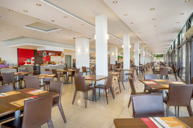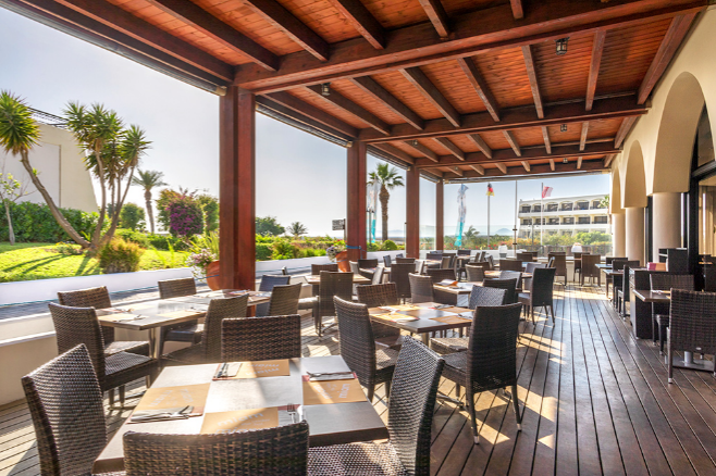 Vous serez logés en formule « tout compris » Le Restaurant Principal vous propose de délicieux buffets pour le petit-déjeuner, le déjeuner et le dîner, allant des fruits frais aux plats chauds appétissants, à déguster en intérieur ou en terrasse pour profiter d’une vue éblouissante sur la mer. Petit-déjeuner : 7h00 – 10h30 Déjeuner : 12h30 – 14h30 Dîner : 18h30 – 21h30 Le Restaurant à la carte « ELIES » vous propose une cuisine de spécialités grecques pour vos diners. Ce restaurant vous accueille du 1er juin au 30 septembre de 19h à 21h30 sous réserve de réservation (1 dîner à la carte est inclus pour chaque séjour de 7 jours ou plus hors boissons). Le Bar principal vous propose de siroter un cocktail en admirant le couché de soleil. Ouvert de 17h30 à 1h00 du matin, ce bar ambiancé vous sert boissons locales avec ou sans alcool, bières fraiches et sélection de vins locaux jusqu’à 23h dernière commande Le Snack Bar de la piscine situé au bord de la piscine principale est ouvert de 10h00 à 23h00, ce bar vous propose un service snack de 12h00 à 16h00 : salades fraiches, snacks sucrés et salés, glaces boissons locales et internationales avec ou sans alcools, bière, vin rouge et blanc, café et thé. (les horaires peuvent varier en début et fin de saison)
